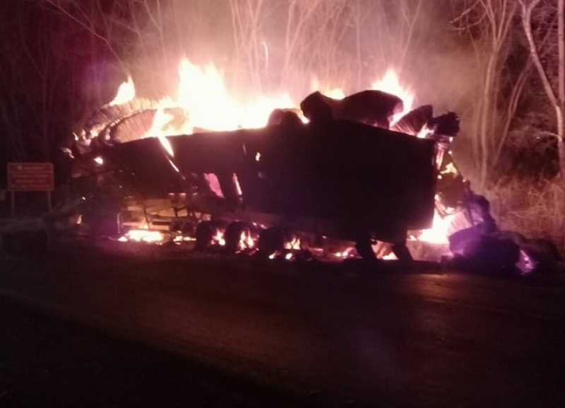 Por volta das 22:30h desta quinta-feira (28), uma carreta carregada de algodão pegou fogo na BR-354, próximo a Iguatama.