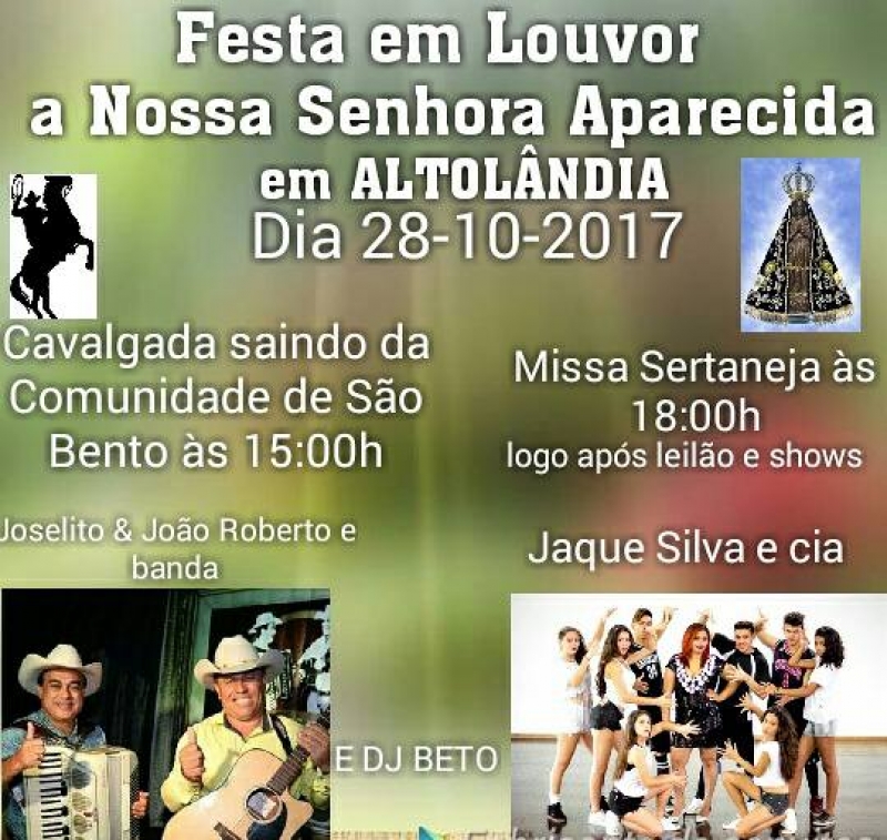 A Festa em Louvor a Nossa Senhora Aparecida acontece neste sábado (28), em Altolândia. Haverá cavalgada as 15h:00, saindo da Comunidade de São Bento, será uma cavalgada religiosa, sem bebidas alcoólicas durante o trajeto. A cavalgada chegará em Altolândia e terá a bênção aos cavaleiros, e acontecerá a Missa Sertaneja. Tenham respeito e carinho pelos cavalos, não maltrate-os! Não joguem lixo durante o trajeto da cavalgada!