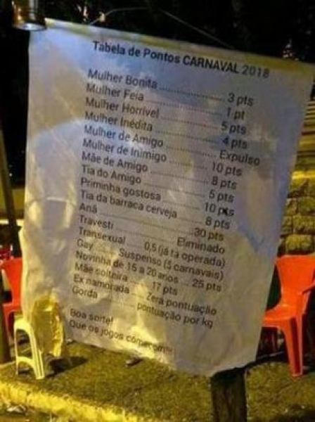 Um cartaz com uma suposta pontuação para a “pegação” no carnaval de Bom Sucesso, na região Centro-Oeste de Minas, está dando o que falar na cidade. No facebook, dezenas de mulheres – e até de homens – postaram comentários contra o que classificaram de “cultura de misoginia, homofobia e gordofobia”.