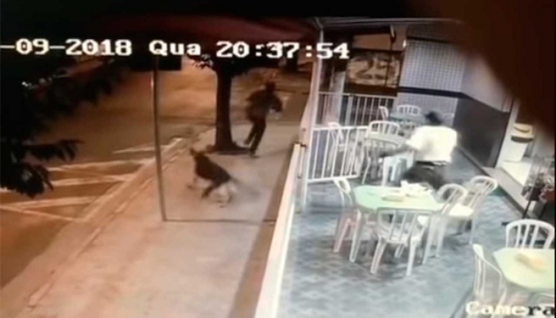 Câmeras internas de segurança registrou o momento em que o bandido fugiu, com medo da cadela.