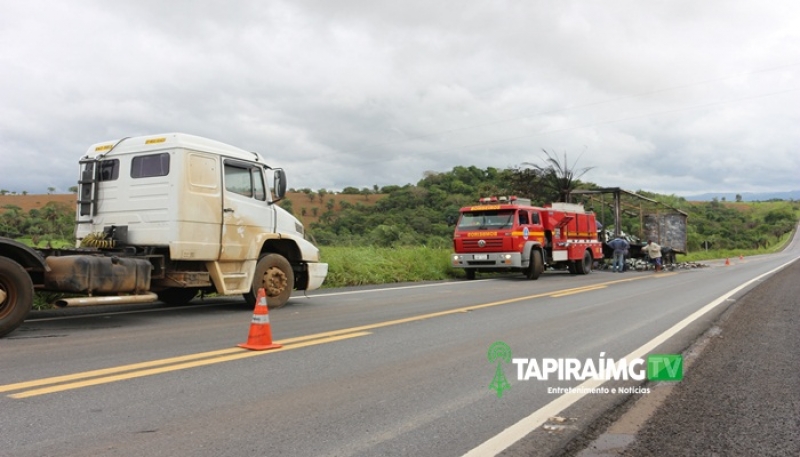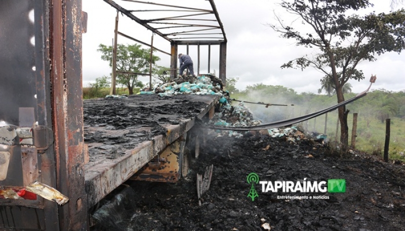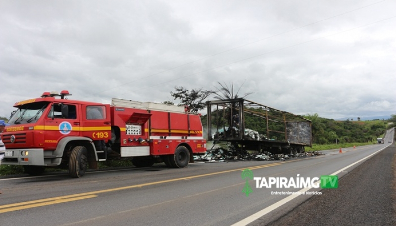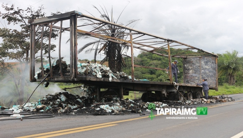 Uma carreta semi-reboque, com placas de Mogi Guaçu/SP, carregada de fraldas e papel higiênico pegou fogo por volta das 7h30 da manhã deste domingo (25), em Bambuí.