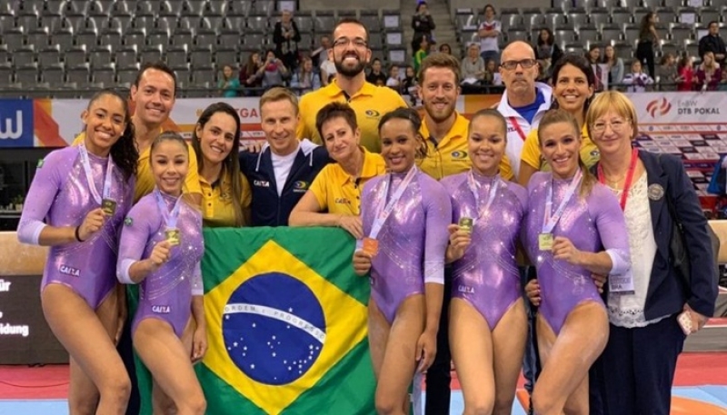 A seleção é formada pelas atletas Flávia Saraiva, Jade Barbosa, Rebeca Andrade, Thaís Fidelis e Carolyne Pedro, que conquistaram 164.396 pontos, à frente da Rússia, com 159.496, e da Holanda, que fez 153.763 pontos.