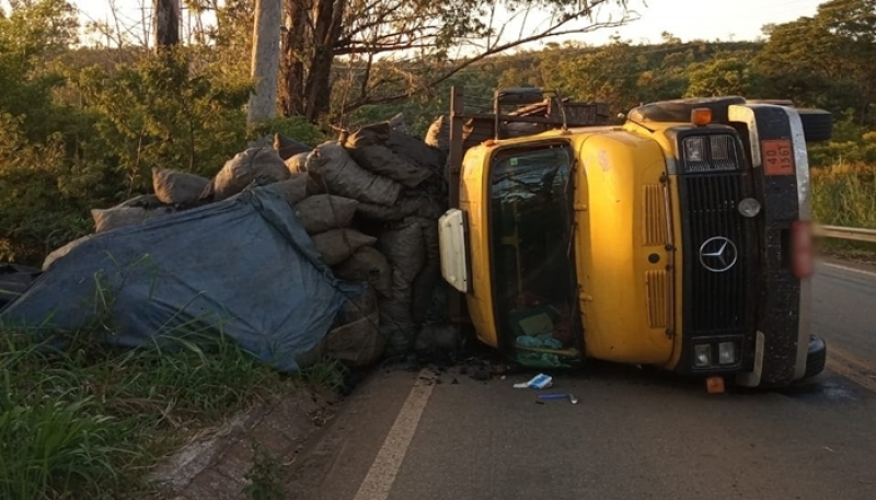 Um motorista, de 66 anos, ficou ferido na tarde desta quinta-feira (28), após um caminhão carregado de carvão tombar na BR-352, em Pitangui. O acidente aconteceu por volta das 17h15, na altura do KM 02.
