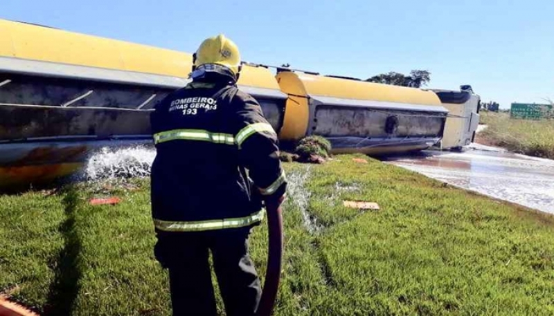 Um acidente envolvendo uma carreta que transportava líquido inflamável mobiliza equipes do Corpo de Bombeiros na manhã desta quinta-feira em Pirajuba, no Triângulo Mineiro.