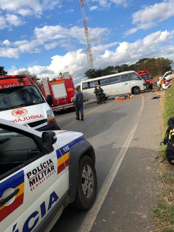 Uma colisão entre um micro-ônibus e um veículo de passeio deixou uma vítima morta e outras cinco feridas na tarde desta quarta-feira (12) na MG-170, em Pimenta.