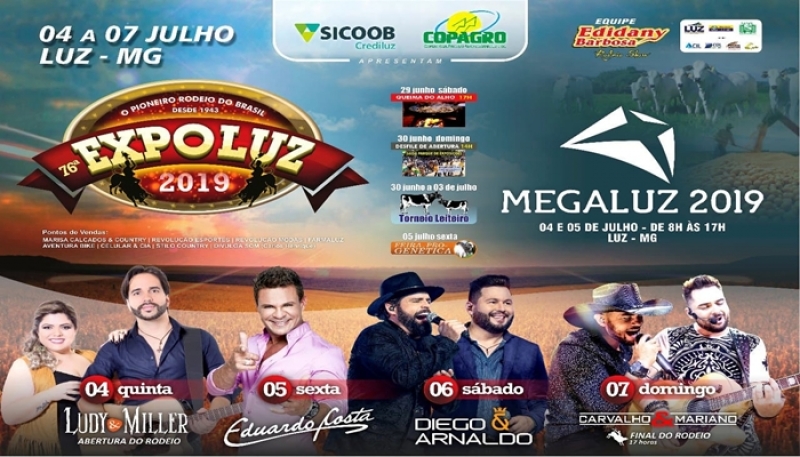 A 76ª Expô Luz acontece entre os dias 04 e 07 de julho. A Expô Luz é considerada como umas das festas mais famosas da região Centro-Oeste de Minas.