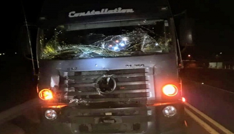 Com o impacto, a frente do caminhão VW/24.250 foi danificada. Apesar do susto, ninguém se feriu.