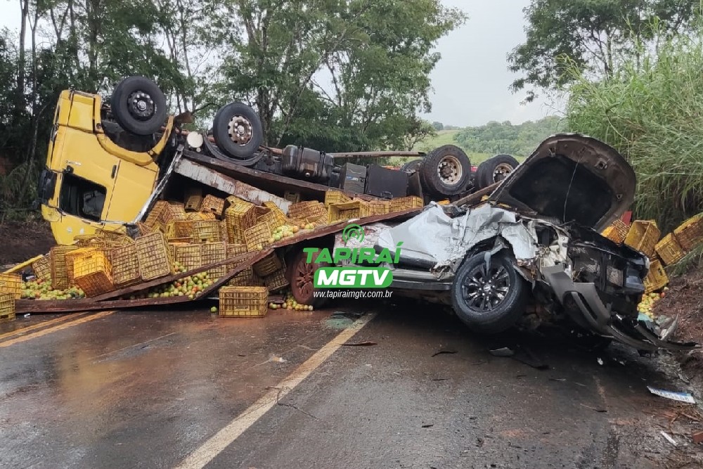 Vídeo: Acidente entre carro e caminhão carregado com batatas deixa três feridos na BR-262, em Luz