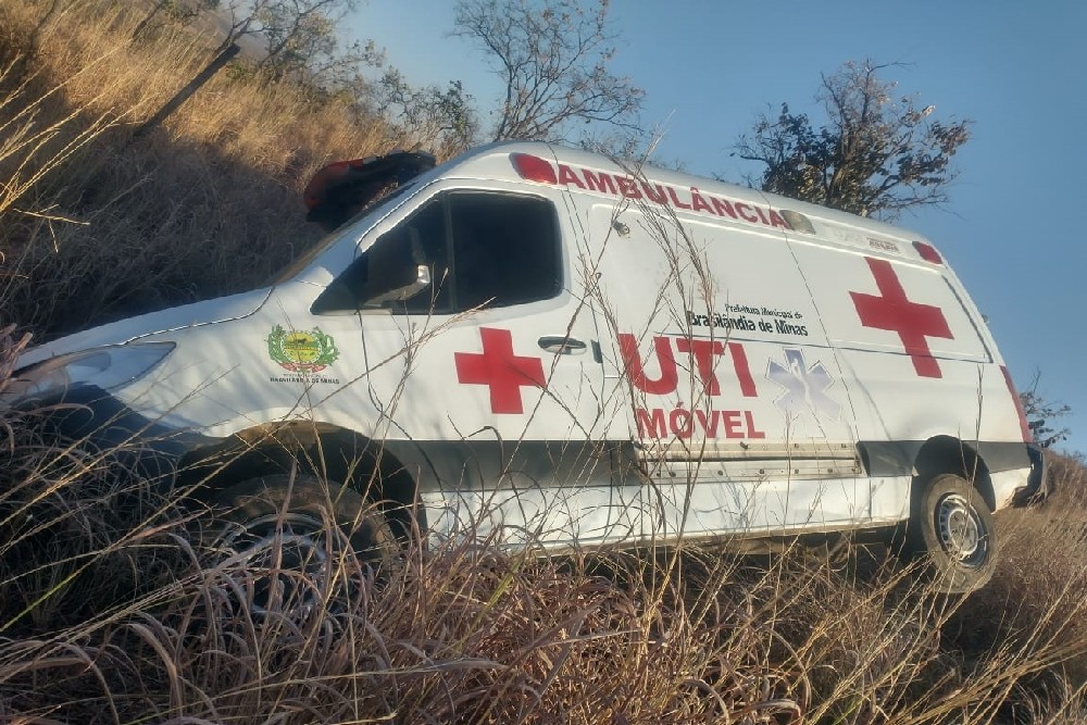 Ambulância sai da pista durante transporte de paciente na MG-410, no Alto Paranaíba