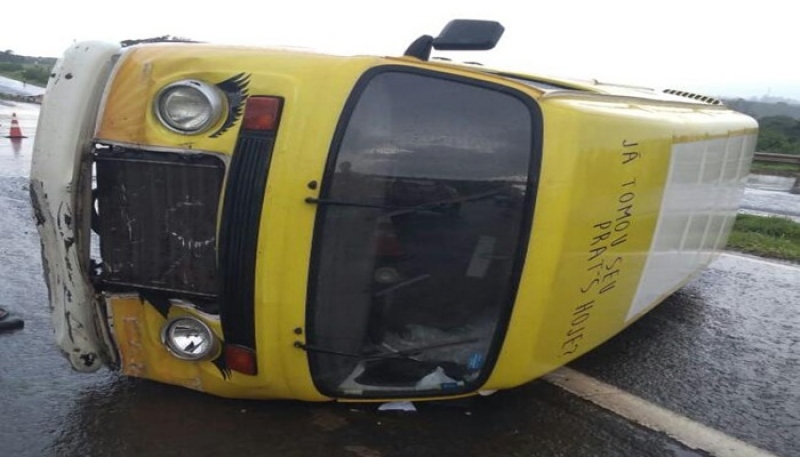 Kombi derrapa em pista molhada e tomba na BR-262