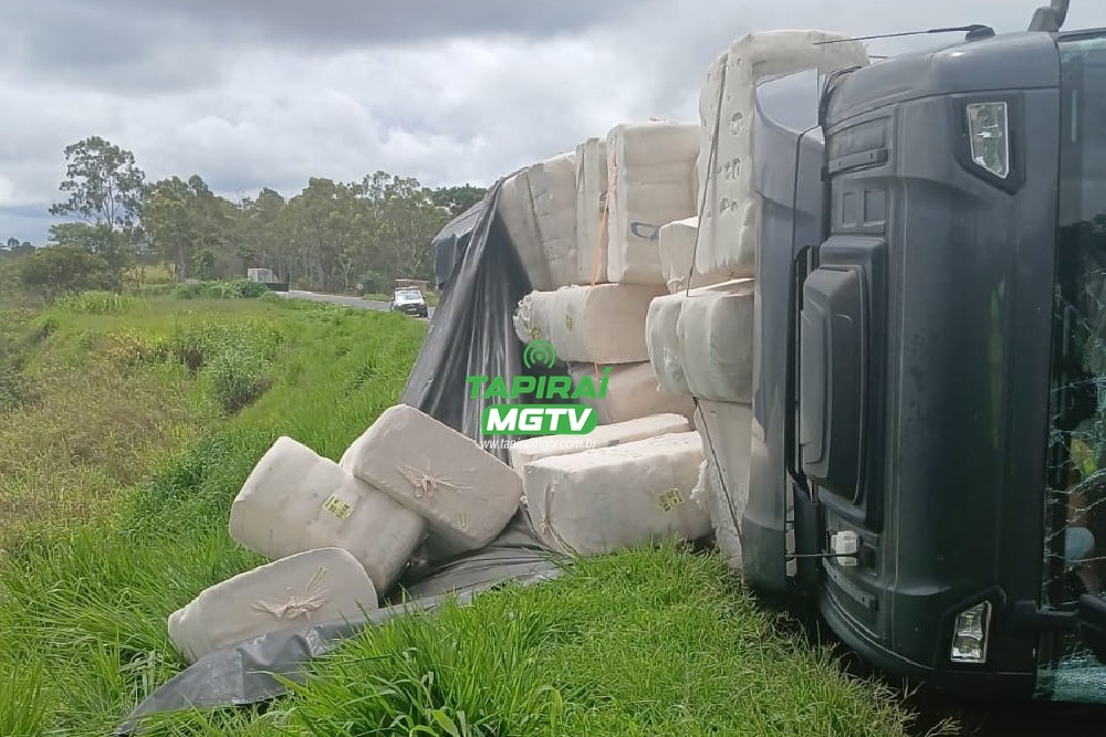 Vídeo: Carreta carregada de algodão tomba na BR-262 em Campos Altos