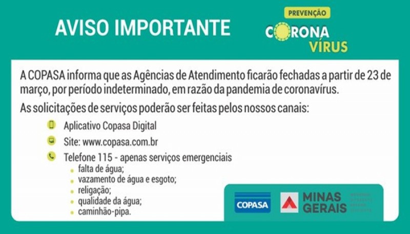 Copasa fecha agências para evitar propagação do coronavírus; veja como será o atendimento