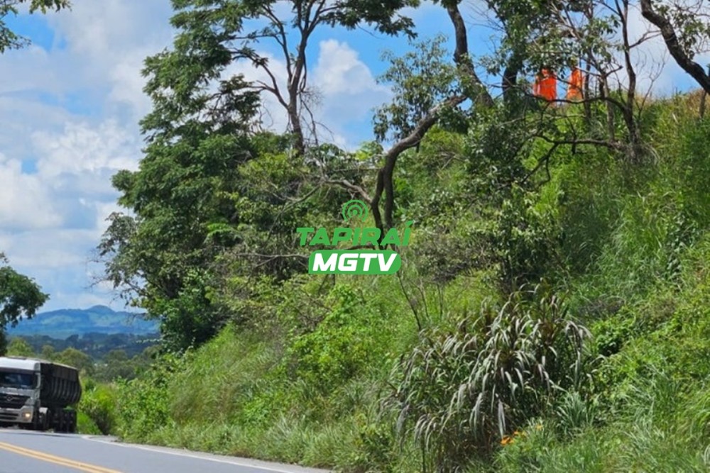 Corpo de Bombeiros realiza corte de árvore caída na BR-354, entre Arcos e Iguatama