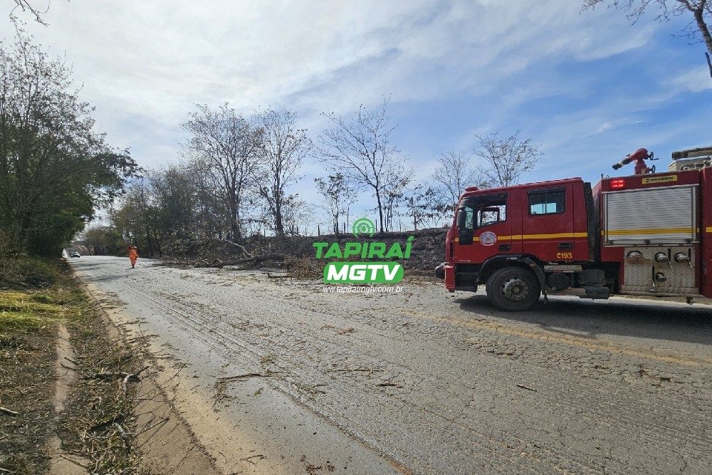 Bombeiros realizam corte de árvore caída sobre a LMG-827, próximo ao IFMG, em Bambuí
