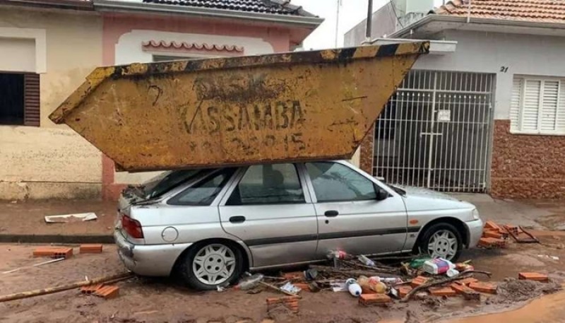 Cratera engole veículos e caçamba para sobre carro após chuvas em SP