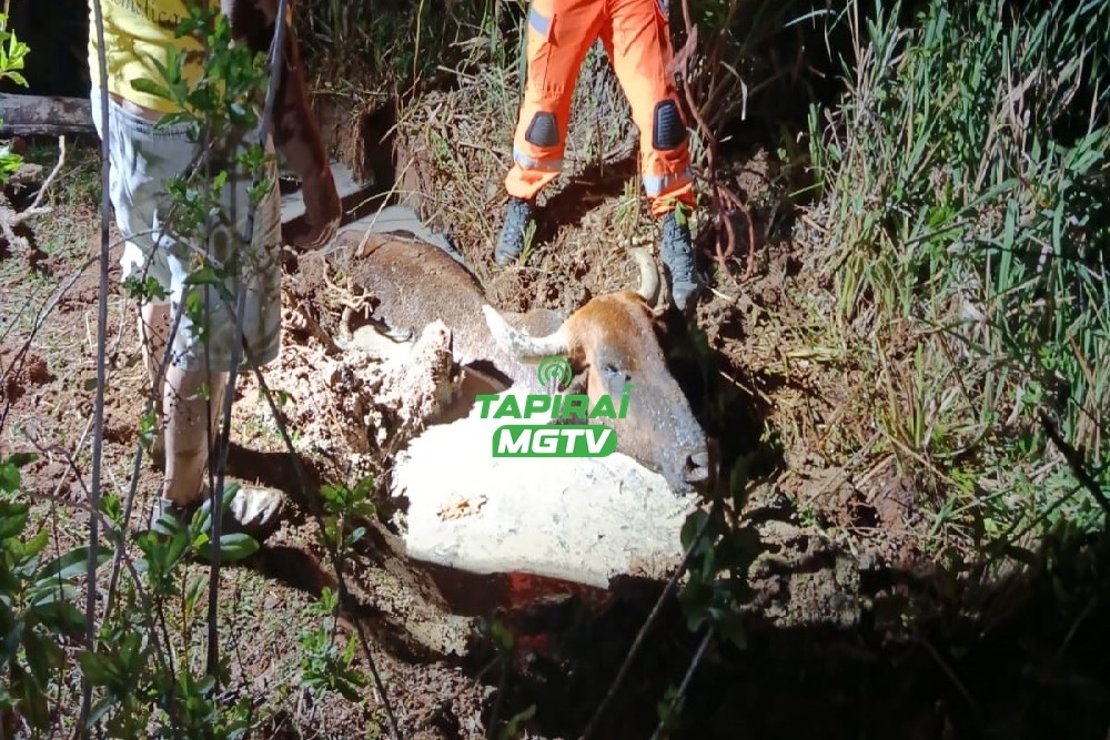 Bombeiros realizam salvamento de vaca atolada em brejo na zona rural da cidade de Formiga
