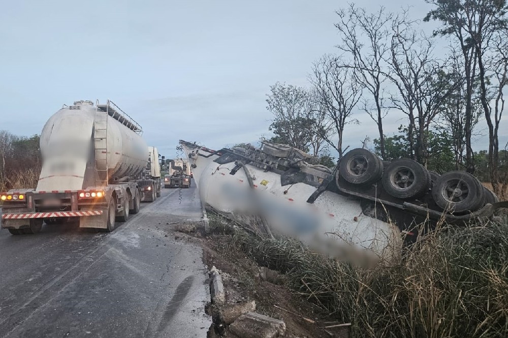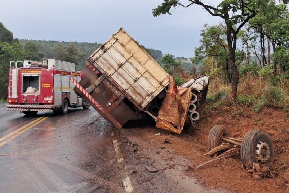 Vídeo: Carreta com 31 toneladas de pó calcário tomba às margens da BR-354 em Formiga
