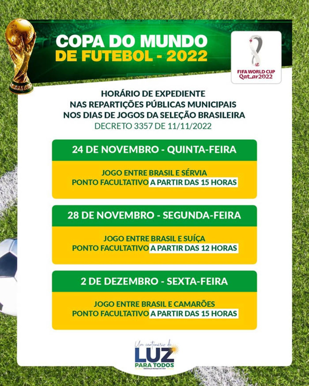 Prefeitura de Luz decreta expediente reduzido nos dias de jogos do Brasil na Copa do Mundo