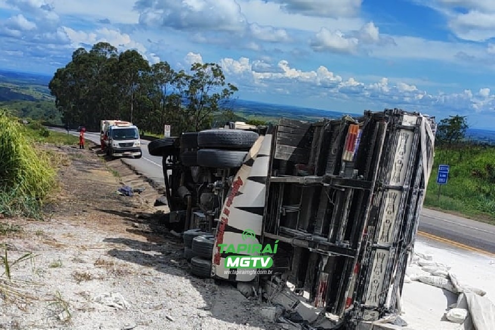 Vídeo: Carreta carregada com sacos de ração tomba e deixa trânsito lento na BR-262, em Luz