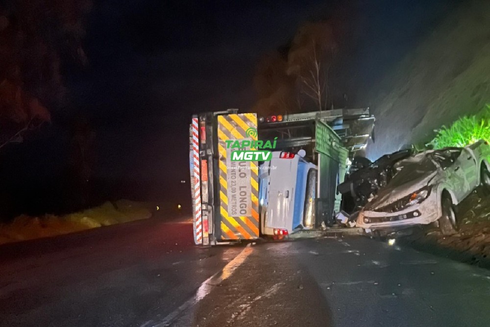 Carreta carregada com ovos tomba, arrasta carro e deixa dois feridos na BR-262, em Luz