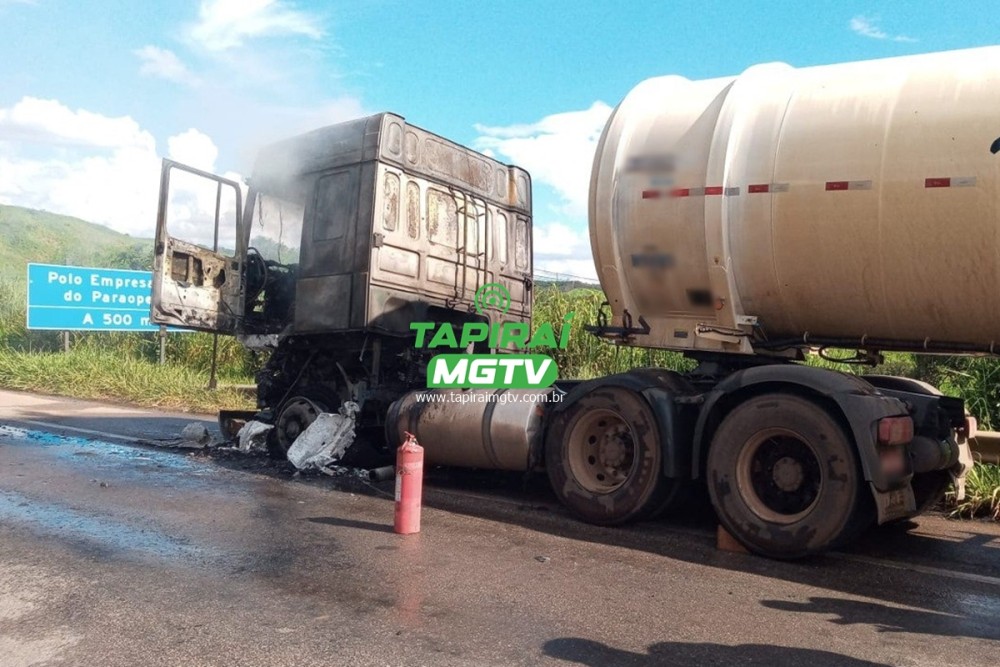 Carretas pegam fogo após colisão e motorista morre na BR-262