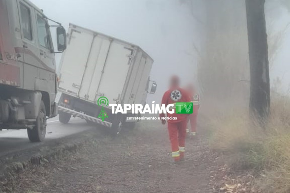 Devido à neblina, caminhão sai da pista e para em área de escape na BR-262 em Campos Altos
