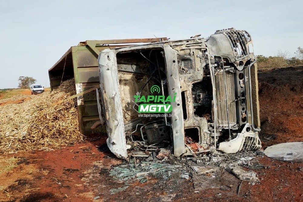 Vídeo: Carreta carregada de cana pega fogo após tombar na BR-354, em Bambuí