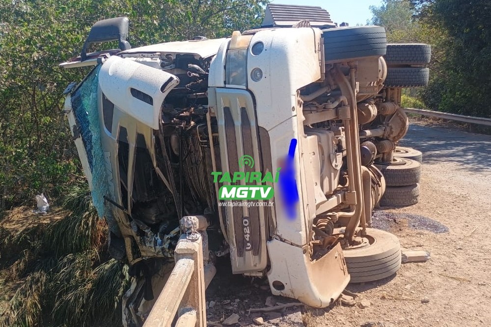 Vídeo: Motorista fica ferido após carreta tombar sobre ponte na BR-354, em Bambuí