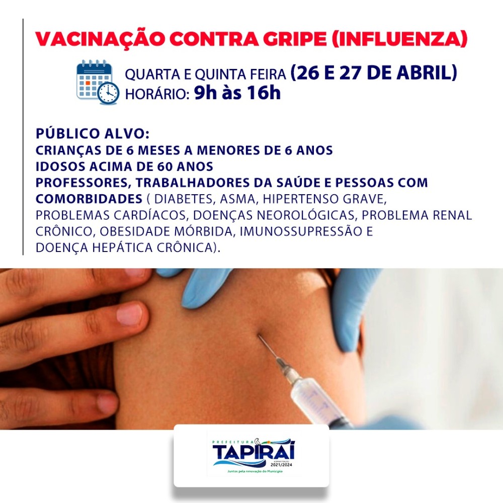 Tapiraí: Vacinação contra a gripe acontece nesta quarta e quinta-feira