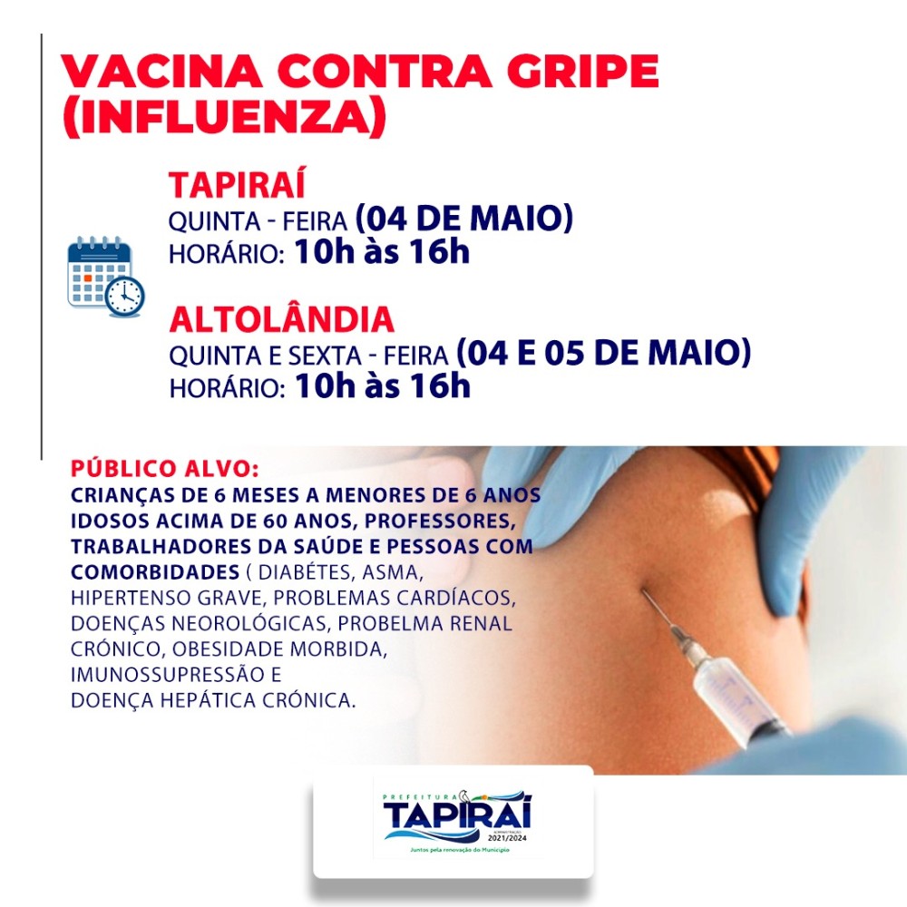 Tapiraí e Altolândia: Vacinação contra a gripe acontece nesta quinta e sexta-feira